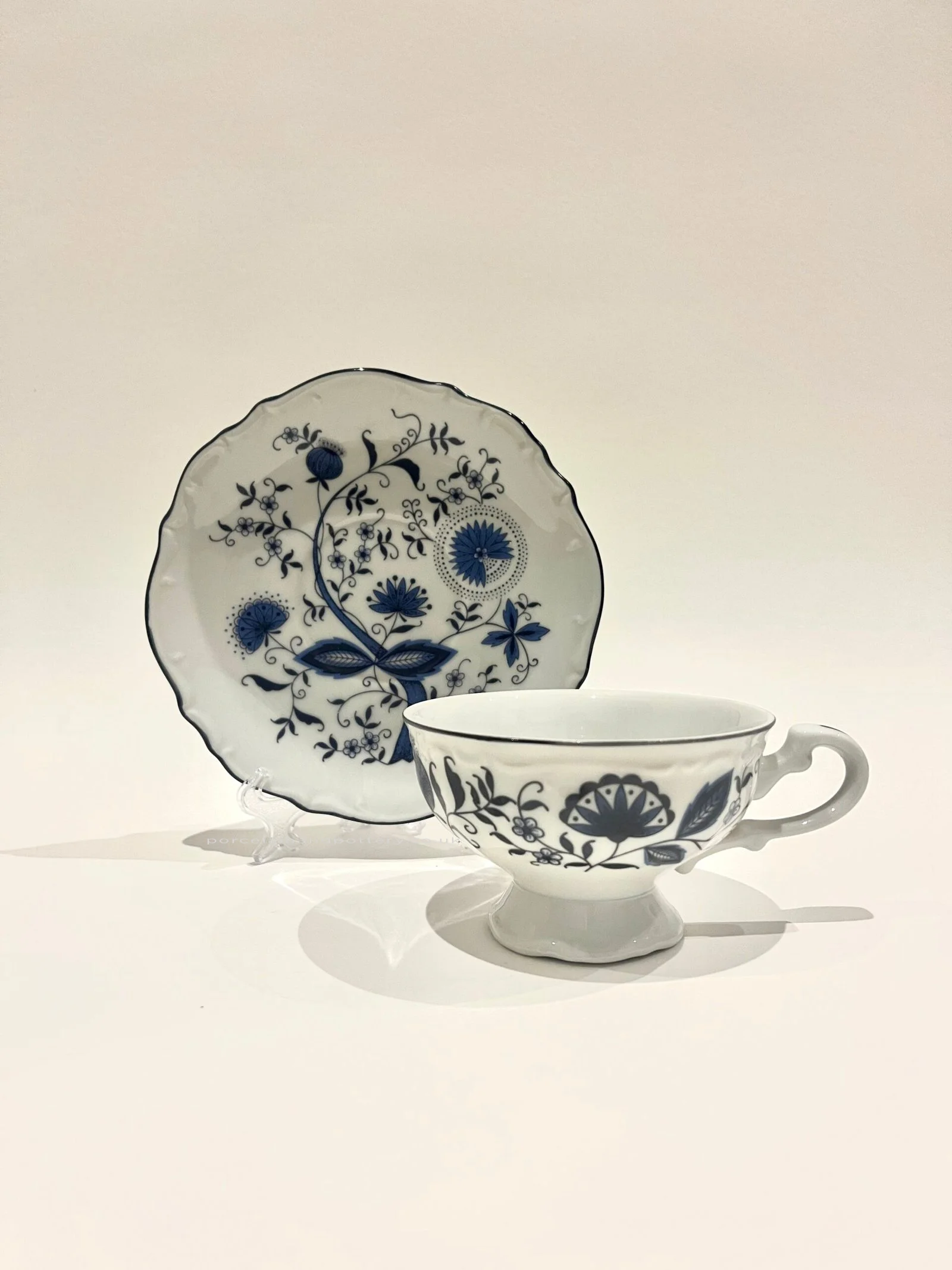 Sone China Made in Japan 3318 is featuring a variation of a blue and white porcelain pattern which is often called “Blue Onion”. Its original design was inspired by Chinese porcelain and adopted in Europe.
